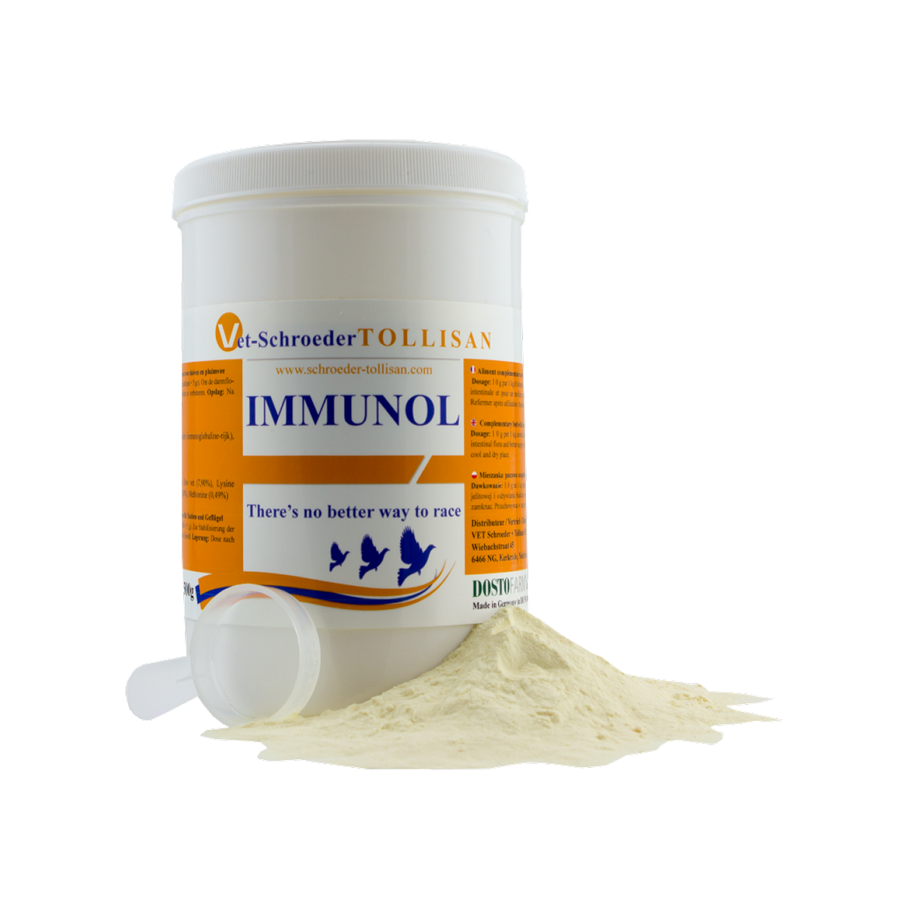 O Tollisan Immunol acrescenta a albumina ausente nos alimentos em 100 %. Se mesmo assim juntar leguminosas, os pombos ficarão sobrenutridos, o que é um dos grandes erros na época de viagem. Os aminoácidos lisina e metionina contidos no Immunol têm ainda um efeito positivo na digestão da albumina e o mineral potente fósforo reforça ainda o metabolismo energético. Aqueles pombos que voltam do voo com um atraso de alguns dias, tendo emagrecido, podem receber uma injecção no papo com Immunol, diluído em água (uma colher de sopa de Immunol, meia chávena de água morna, várias vezes).