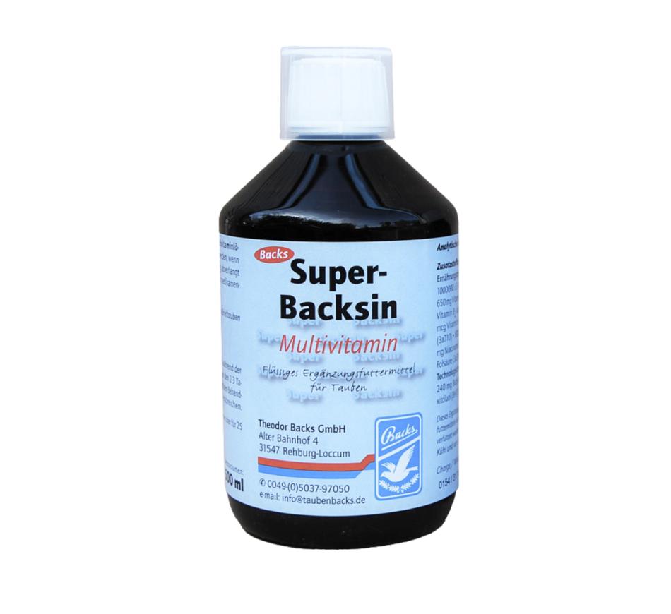 Backs Super-Backsin é uma solução multivitamínica para pombos que fornece vitaminas extra para recuperação rápida;