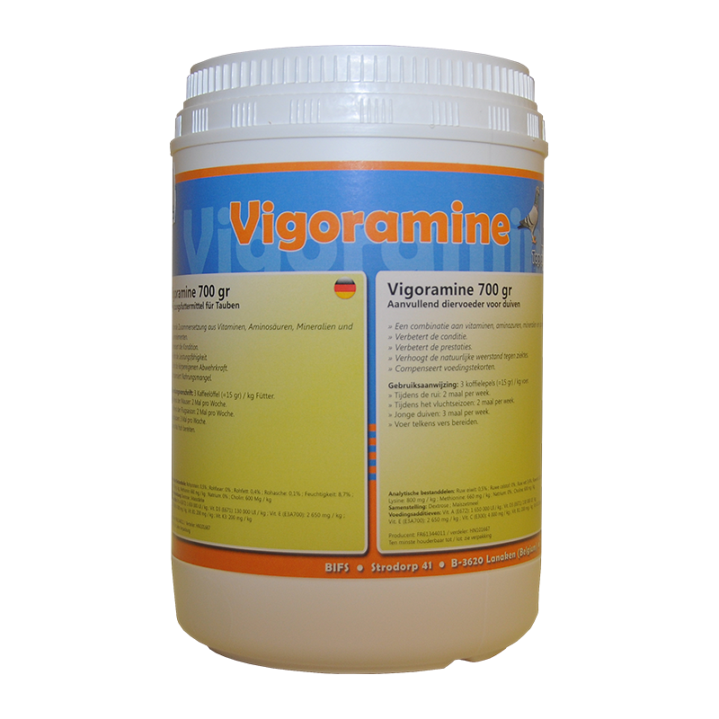 As vitaminas são ingredientes ativos essenciais para a saúde e o desempenho dos pombos. Os chamados aminoácidos essenciais (arginina, histidina, isoleucina, leucina, lisina, metionina, fenilalanina, treonina, triptofano e valina) não podem ser sintetizados pelo organismo do pombo e, portanto, devem estar presentes na ração. O Vigoramine também é importante para manter o equilíbrio de minerais e oligoelementos. Os micronutrientes do Vigoramine mantêm a ração diária dos pombos equilibrada, sem o risco de sobredosagem, prevenindo assim todas as deficiências.